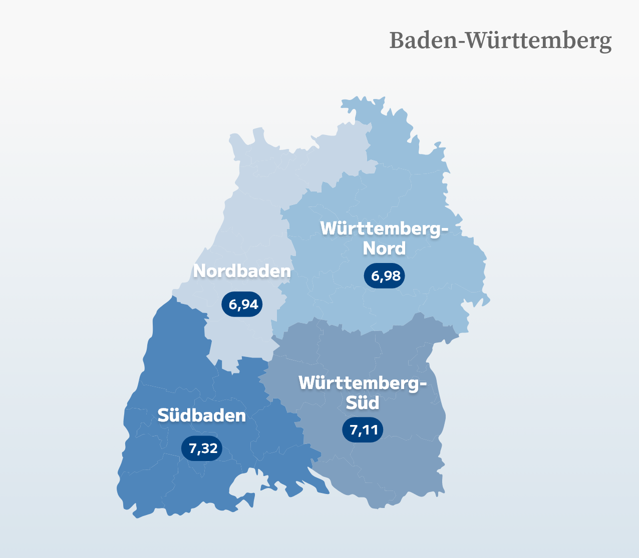 Regional zeigen sich jedoch deutliche Unterschiede: In Südbaden (Regierungsbezirk Freiburg, 2025: 7,32 Punkte) liegt die Lebenszufriedenheit deutlich über dem gesamtdeutschen Mittel, in Württemberg-Süd (Regierungsbezirk Tübingen, 2025: 7,11) etwa auf Durchschnittsniveau. Deutlich unterdurchschnittlich sind dagegen Württemberg-Nord (Regierungsbezirk Stuttgart, 2025: 6,98) und Nordbaden (Regierungsbezirk Karlsruhe, 2025: 6,94). (Abbildung 2).