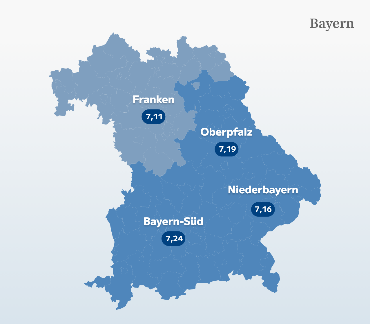 Im Vergleich zu Niederbayern (7,16 Punkte), der Oberpfalz (7,19 Punkte) und Bayern-Süd (7,24 Punkte) sind die Franken (7,11 Punkte) leicht unzufriedener mit ihrem Leben.