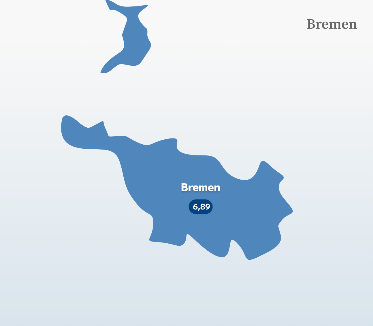 Die Lebenszufriedenheit der Bremer stabilisiert sich auf dem Vor-Corona-Niveau und liegt heute bei durchschnittlich 6,89 Punkten. Die Differenz zu Gesamtdeutschland liegt bei 0,21 Punkten. Der eher schwache Wert des Vorjahres (6,76 Punkte) kann somit eher als Ausreißer gewertet werden.