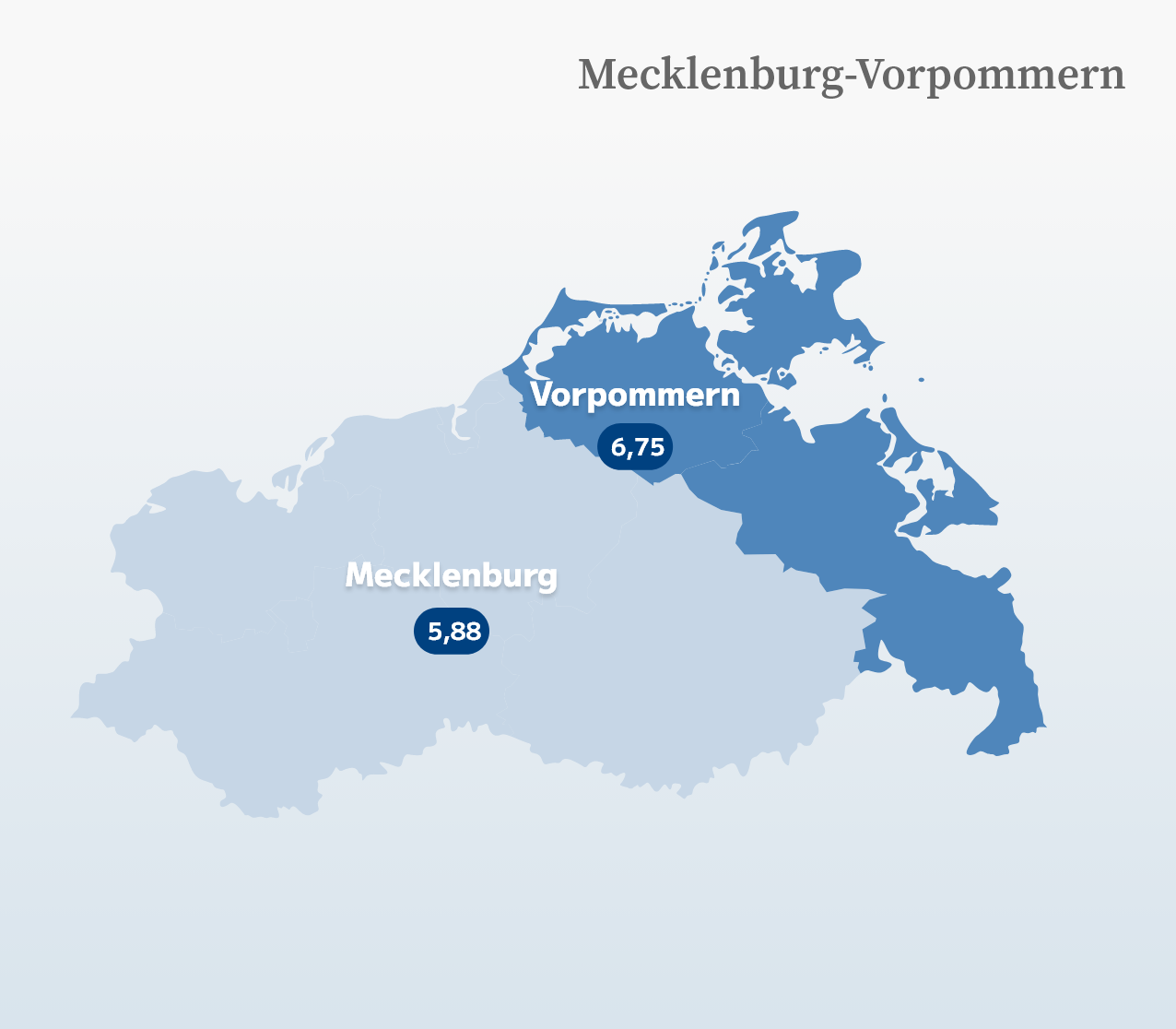 Erhebliche Unterschiede der Zufriedenheit zwischen den Landesteilen Mecklenburg (5,88 Punkte) und Vorpommern (6,75 Punkte). Allerdings ist selbst die höhere Lebenszufriedenheit in Vorpommern im bundesweiten Vergleich klar unterdurchschnittlich.