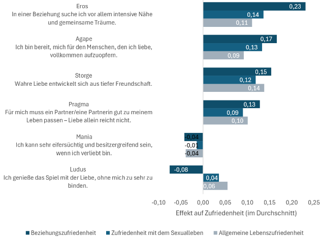 Der romantische Liebestyp Eros »performt« in der Beziehungszufriedenheit am besten (Effekt: +0,23 Punkte). Die intensive, stark emotionale aber eben auch verbindliche Liebe geht eher mit Beziehungsglück einher als das lockere, unverbindliche Spiel mit der Liebe, wie es der Ludus Liebestyp darstellt (-0,08 Punkte), was wenig überraschend ist. Überraschender ist, dass auch die Zufriedenheit mit dem Sexualleben beim Ludus-Liebestyp geringer ist als beim Eros-Liebestyp. Offenbar scheint ein eher hedonistischer Zugang zur Liebe keine Garantie für ein glückliches Sexualleben zu sein.